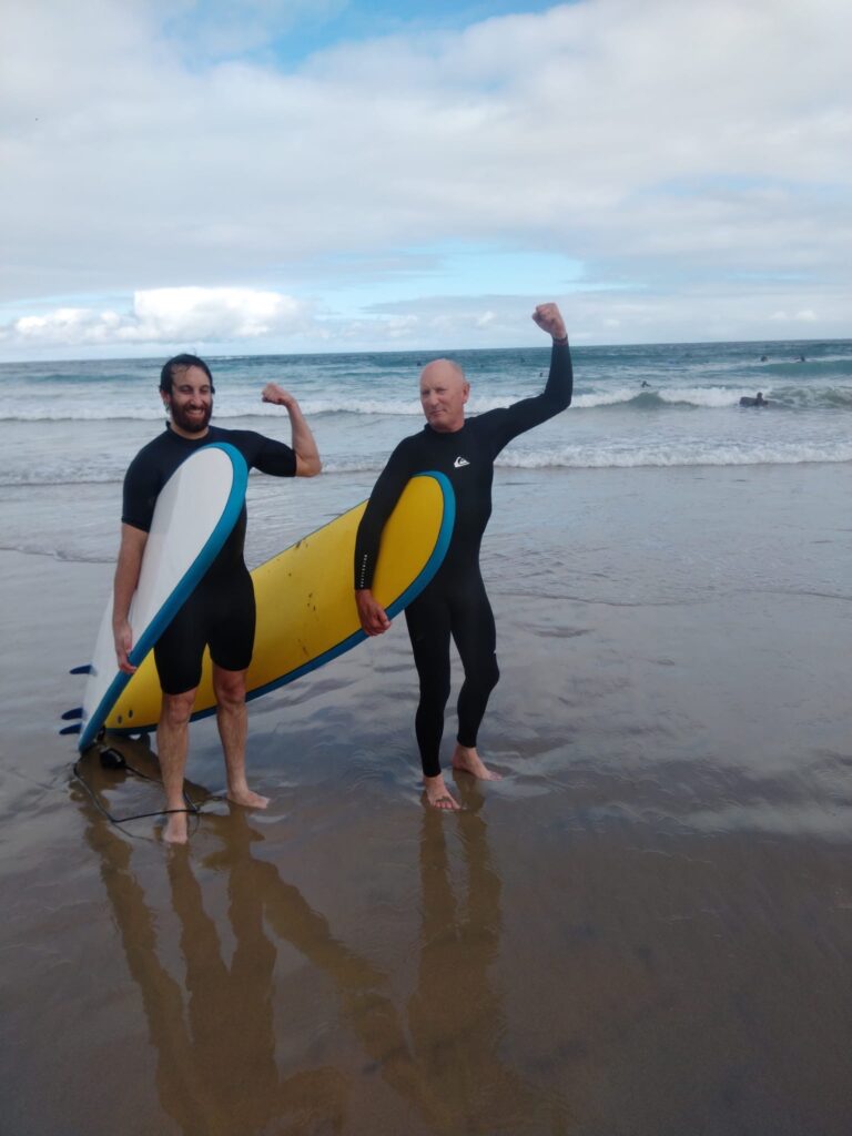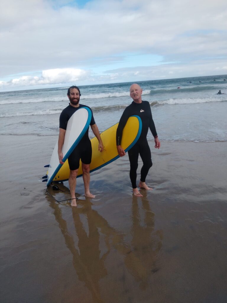 After loading up on a fish and chips feast, we grabbed the boards and headed into the surf to catch a few waves. It was certainly a mixed bag, but everyone, from beginner to low intermediate, had a blast. We’re now back at the house, the keg is attached and getting plenty of love, and the lamb is about to go on the spit. It should be a terrific evening to celebrate a terrific bloke!
