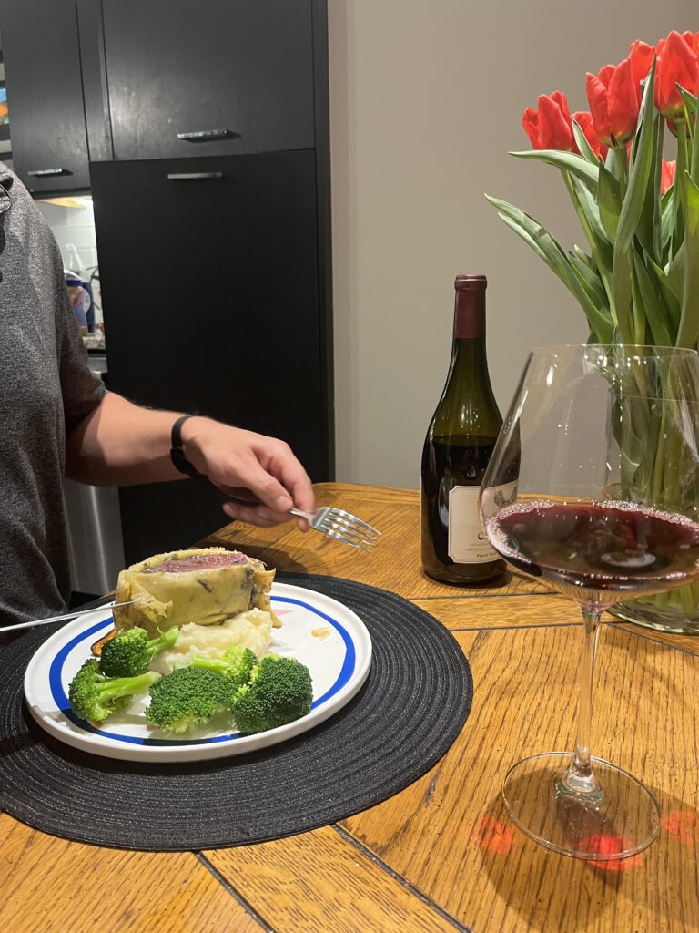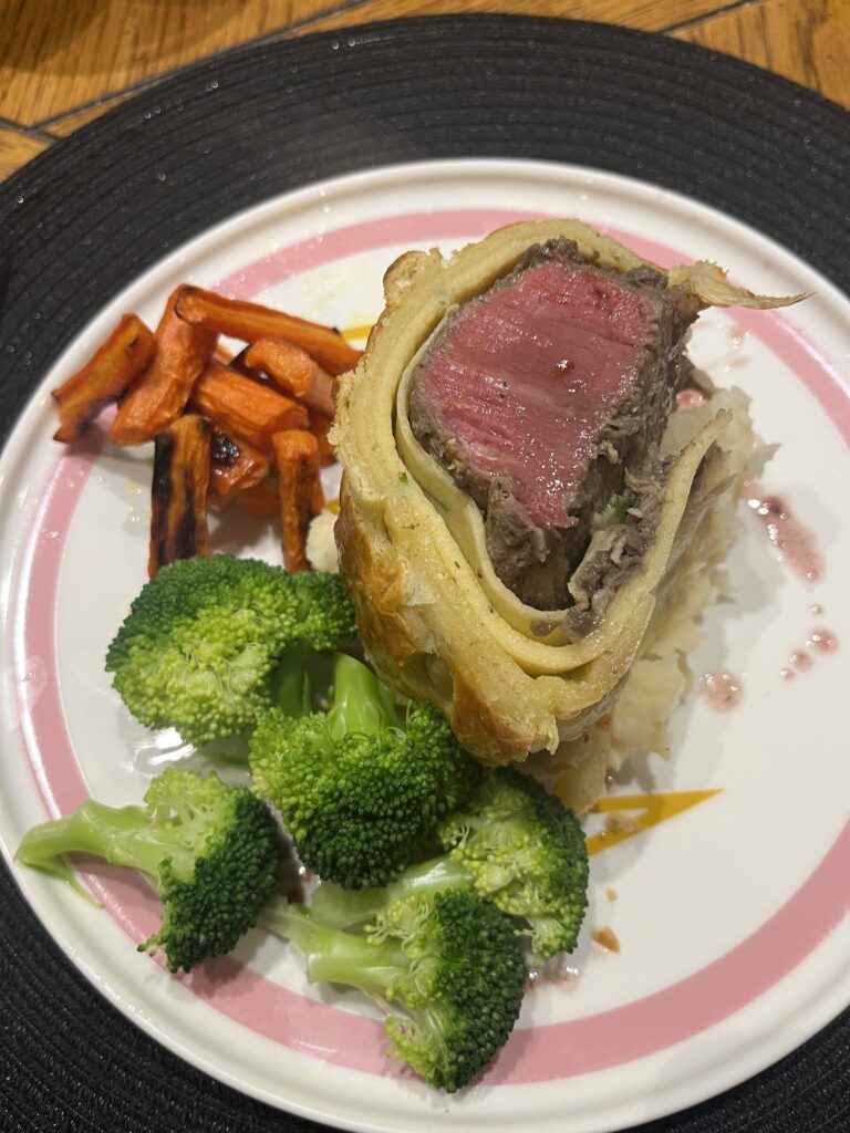 For me, I love to show my love through cooking. This evening I made my favourite; Beef Wellington, Mashed Potatoes, Honey Glazed Roasted Carrots and Steamed Broccoli. Beef Wellington is an exercise in components; it takes a bit over 3 hours start to finish, and while the constituent parts are all fairly straightforward, it is bringing it all together that makes the time and difficulty stretch out.