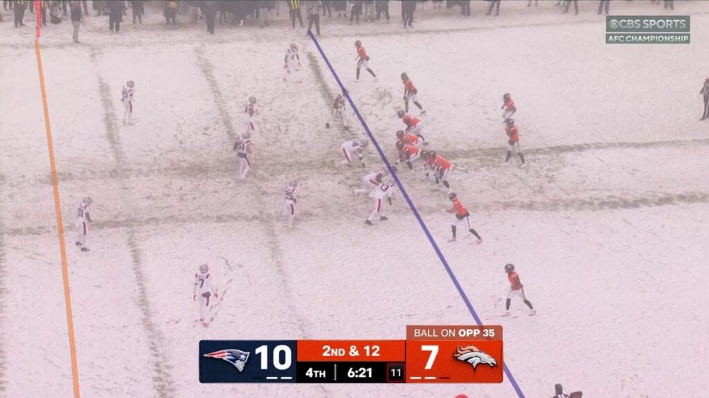 The New England Patriots usually don navy blue, but this afternoon, decided to wear their second strip, all white. A terrible colour if you’re in charge of the team laundry. A great choice if you’re planning on ambushing your opposition by blending into the field.