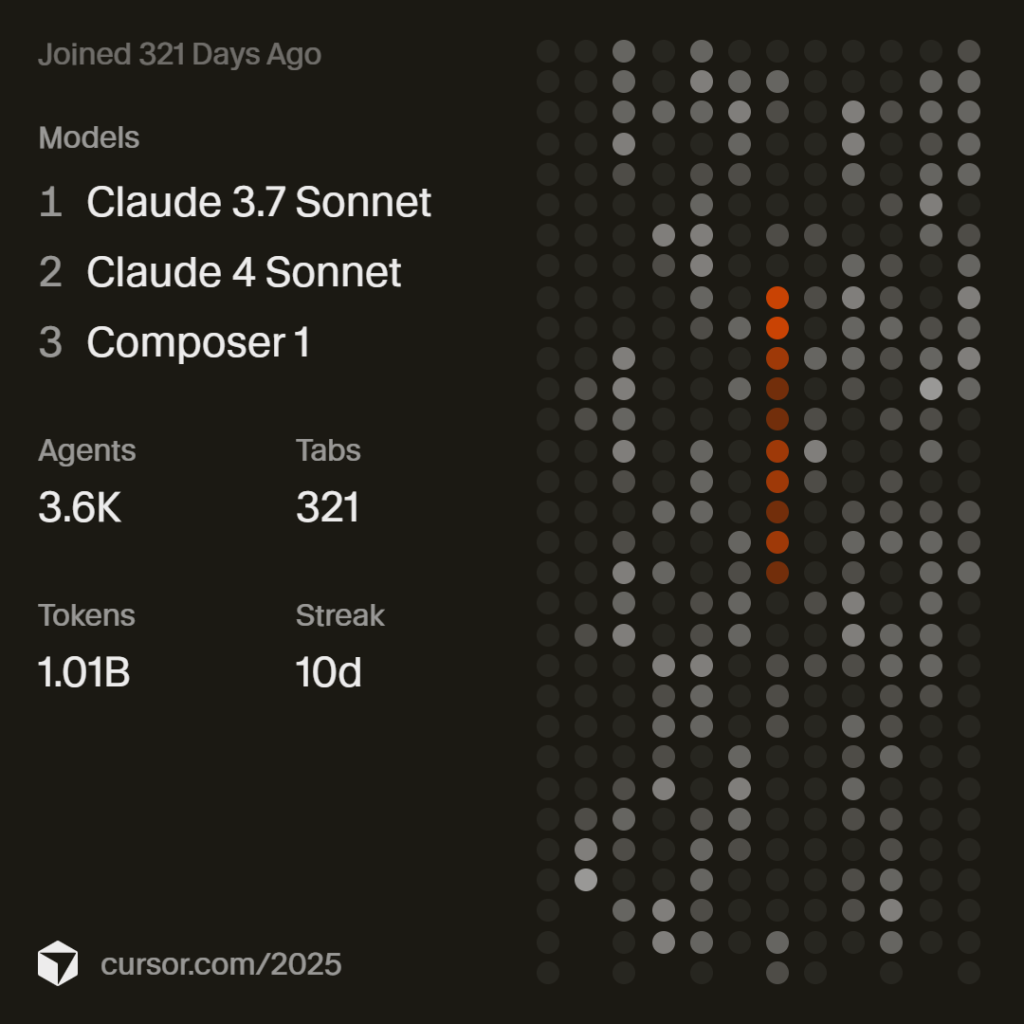 Today, Cursor emailed me to tell me what my usage was like in the 321 days since I created my account. This is their equivalent of Spotify Unwrapped: